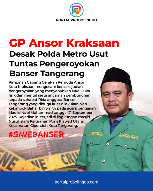 Probolinggo-Pimpinan Cabang Gerakan Pemuda Ansor (GP Ansor) Kota Kraksaan mengecam keras aksi pengeroyokan yang menimpa Rida, anggota Barisan Ansor Serbaguna (Banser) Tangerang, pada acara pengajian Maulid Nabi Muhammad SAW yang digelar 21 September 2025 di Masjid Nurul Islam, Kelurahan Poris Plawad Utara, Kecamatan Cipondoh, Kota Tangerang.