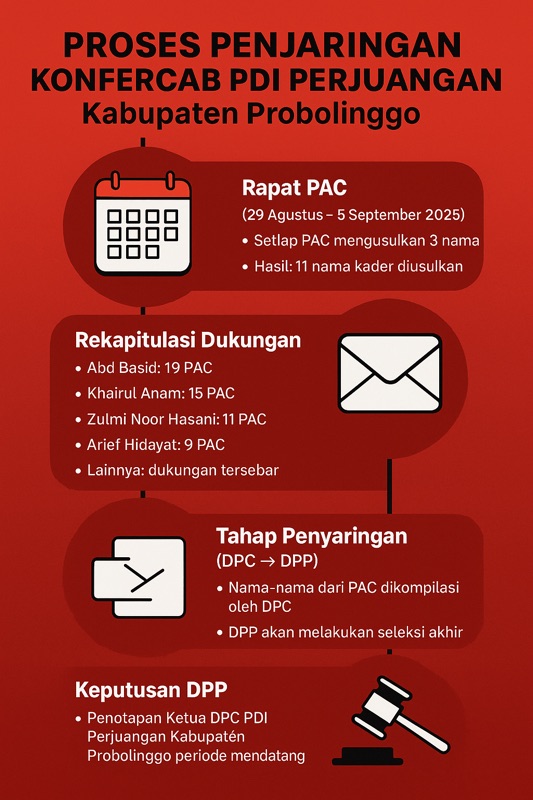 KRAKSAAN-Menjelang pelaksanaan Konferensi Cabang (Konfercab) DPC PDI Perjuangan Kabupaten Probolinggo, dinamika politik internal mulai menghangat. Dari hasil rapat Pimpinan Anak Cabang (PAC) yang berlangsung sejak akhir Agustus, tercatat ada 11 nama kader yang masuk dalam bursa calon ketua.