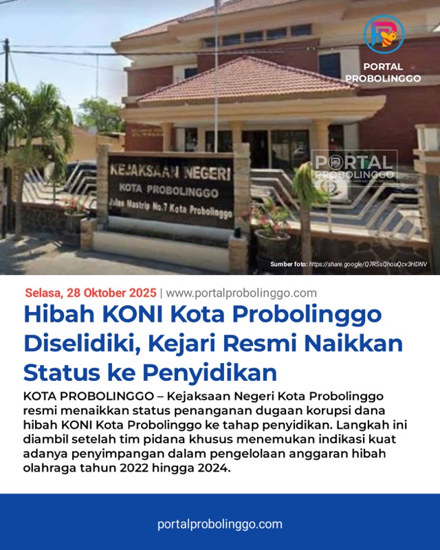 KOTA PROBOLINGGO- Kejaksaan Negeri Kota Probolinggo resmi menaikkan status penanganan dugaan korupsi dana hibah KONI Kota Probolinggo ke tahap penyidikan. Langkah ini diambil setelah tim pidana khusus menemukan indikasi kuat adanya penyimpangan dalam pengelolaan anggaran hibah olahraga tahun 2022 hingga 2024.