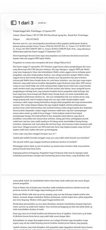 “Hari Kamis tanggal 25 September 2025 eksekusi gagal karena adanya penghadangan dari massa yang diboncengi oleh LSM dan para rekannya, dan juga datangnya anggota DPR Pak Muchlis yang turun langsung ke lokasi… saya kira Pak Muchlis selaku anggota dewan akan berada di tengah, ternyata hanya di satu sisi yaitu termohon,” tulis Agus dalam suratnya.
