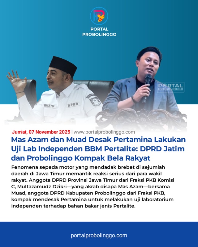 Fenomena sepeda motor yang mendadak brebet di sejumlah daerah di Jawa Timur memantik reaksi serius dari para wakil rakyat. Anggota DPRD Provinsi Jawa Timur dari Fraksi PKB Komisi C, Multazamudz Dzikri—yang akrab disapa Mas Azam—bersama Muad, anggota DPRD Kabupaten Probolinggo dari Fraksi PKB, kompak mendesak Pertamina untuk melakukan uji laboratorium independen terhadap bahan bakar jenis Pertalite.