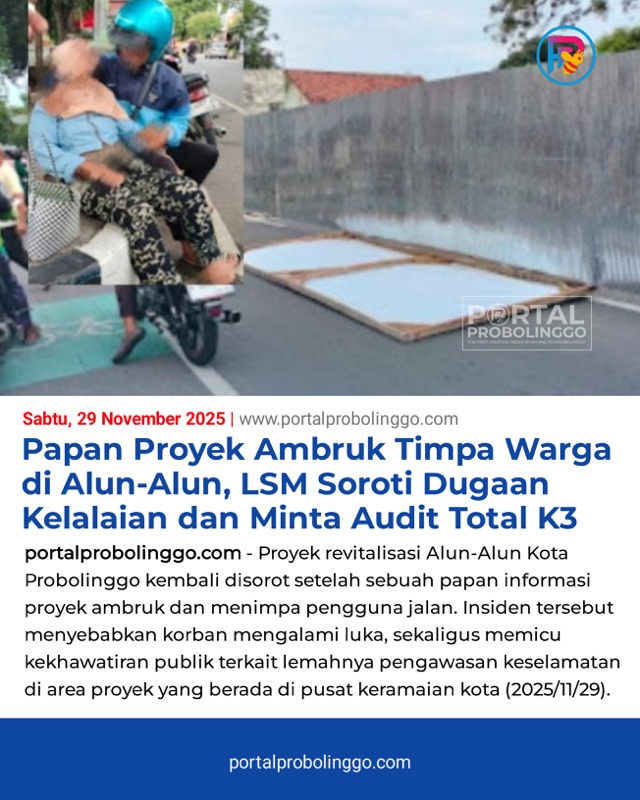 portalprobolinggo.com - Proyek revitalisasi Alun-Alun Kota Probolinggo kembali disorot setelah sebuah papan informasi proyek ambruk dan menimpa pengguna jalan. Insiden tersebut menyebabkan korban mengalami luka, sekaligus memicu kekhawatiran publik terkait lemahnya pengawasan keselamatan di area proyek yang berada di pusat keramaian kota.