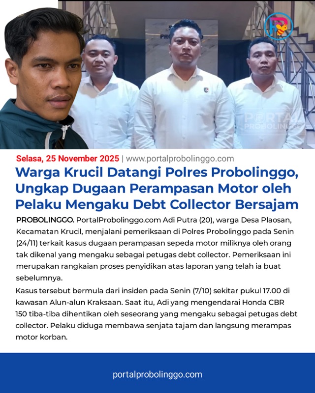 PAJARAKAN . PortalProbolinggo.com Adi Putra (20), warga Desa Plaosan, Kecamatan Krucil, menjalani pemeriksaan di Polres Probolinggo pada Senin (24/11) terkait kasus dugaan perampasan sepeda motor miliknya oleh orang tak dikenal yang mengaku sebagai petugas debt collector. Pemeriksaan ini merupakan rangkaian proses penyidikan atas laporan yang telah ia buat sebelumnya.