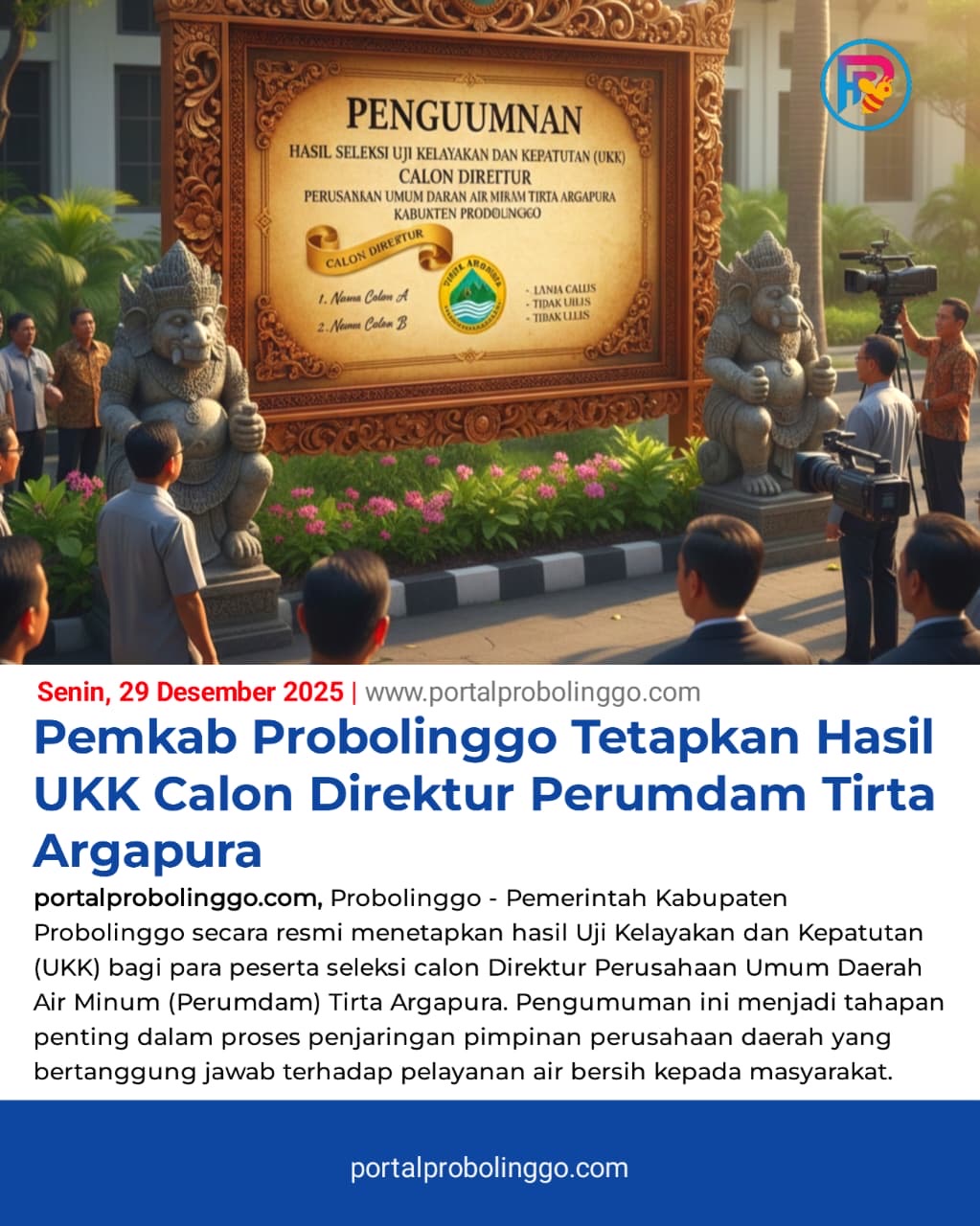 portalprobolinggo.com, Probolinggo - Pemerintah Kabupaten Probolinggo secara resmi menetapkan hasil Uji Kelayakan dan Kepatutan (UKK) bagi para peserta seleksi calon Direktur Perusahaan Umum Daerah Air Minum (Perumdam) Tirta Argapura. Pengumuman ini menjadi tahapan penting dalam proses penjaringan pimpinan perusahaan daerah yang bertanggung jawab terhadap pelayanan air bersih kepada masyarakat.