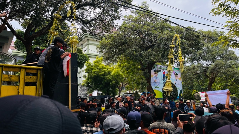 KRAKSAAN-Polemik seleksi Direktur Perusahaan Umum Daerah Air Minum (Perumdam) Tirta Argopuro Kabupaten Probolinggo kian mengemuka setelah dua aksi massa digelar di depan Kantor Bupati Kabupaten Probolinggo, Senin (5/1/2025). Dua kelompok masyarakat menyampaikan aspirasi berbeda terkait proses seleksi tersebut, dengan jumlah massa yang kontras.