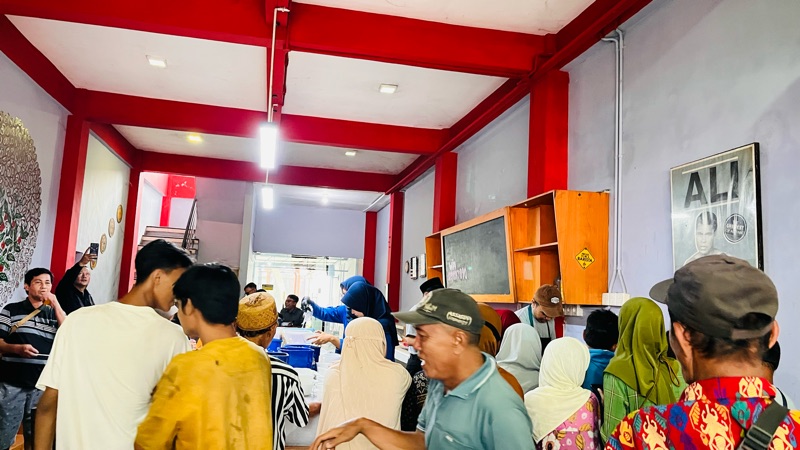 Sejak pagi hari, masyarakat tampak memadati lokasi kegiatan. Antrean panjang terlihat tertib, diisi oleh pekerja harian, ibu rumah tangga, hingga pengemudi ojek online yang memanfaatkan momentum tersebut untuk sarapan gratis sebelum memulai aktivitas.