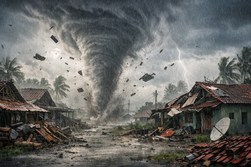 Secara klimatologis, fenomena angin puting beliung di wilayah tropis seperti Indonesia umumnya berkaitan dengan pertumbuhan awan cumulonimbus yang intens, terutama pada masa pancaroba atau peralihan musim. Kondisi atmosfer yang tidak stabil, perbedaan tekanan udara, serta peningkatan suhu permukaan dapat memicu terbentuknya pusaran angin lokal yang berdampak pada kerusakan bangunan ringan dan vegetasi di sekitarnya. (fatahillah/sholeh Iskandar)