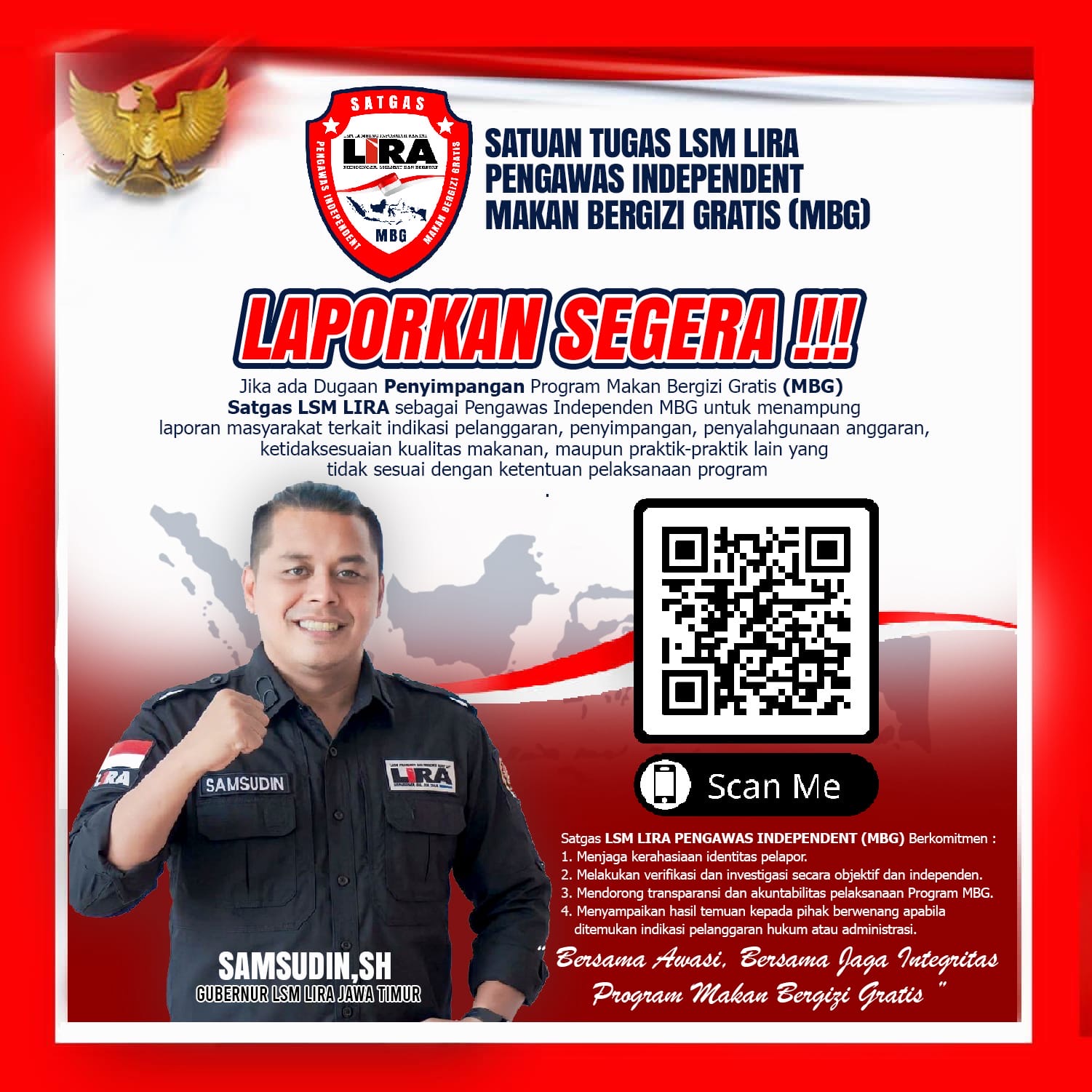 SURABAYA – Satuan Tugas (Satgas) LSM LIRA Jawa Timur menyatakan komitmennya untuk mengawal pelaksanaan Program Makan Bergizi Gratis (MBG) agar berjalan transparan dan tepat sasaran. Komitmen tersebut disampaikan melalui himbauan dan deklarasi resmi yang ditujukan kepada masyarakat serta tenaga pendidik di seluruh wilayah Jawa Timur.