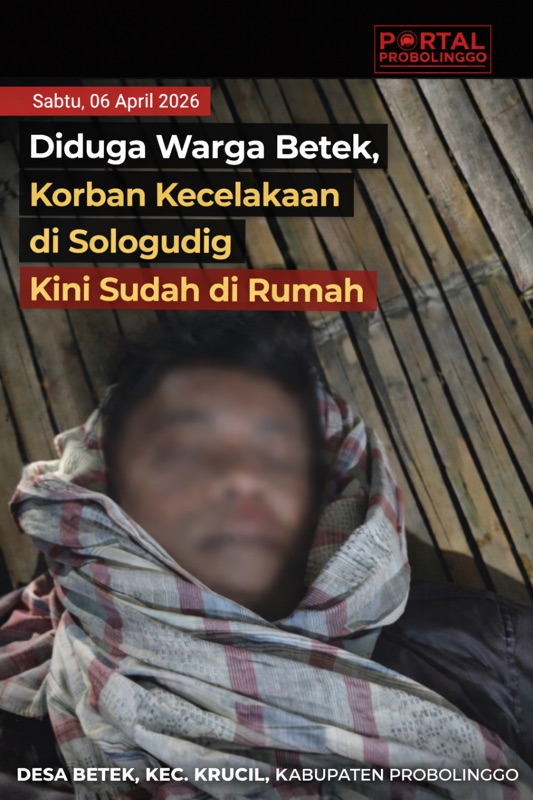 KRUCIL - Peristiwa kecelakaan yang terjadi di Desa Sologudig, Kecamatan Pajarakan, Kabupaten Probolinggo, pada Senin (6/4/2026), mulai menemukan titik terang. Korban yang sebelumnya sempat simpang siur identitasnya, kini diduga merupakan warga Desa Betek, Kecamatan Krucil.